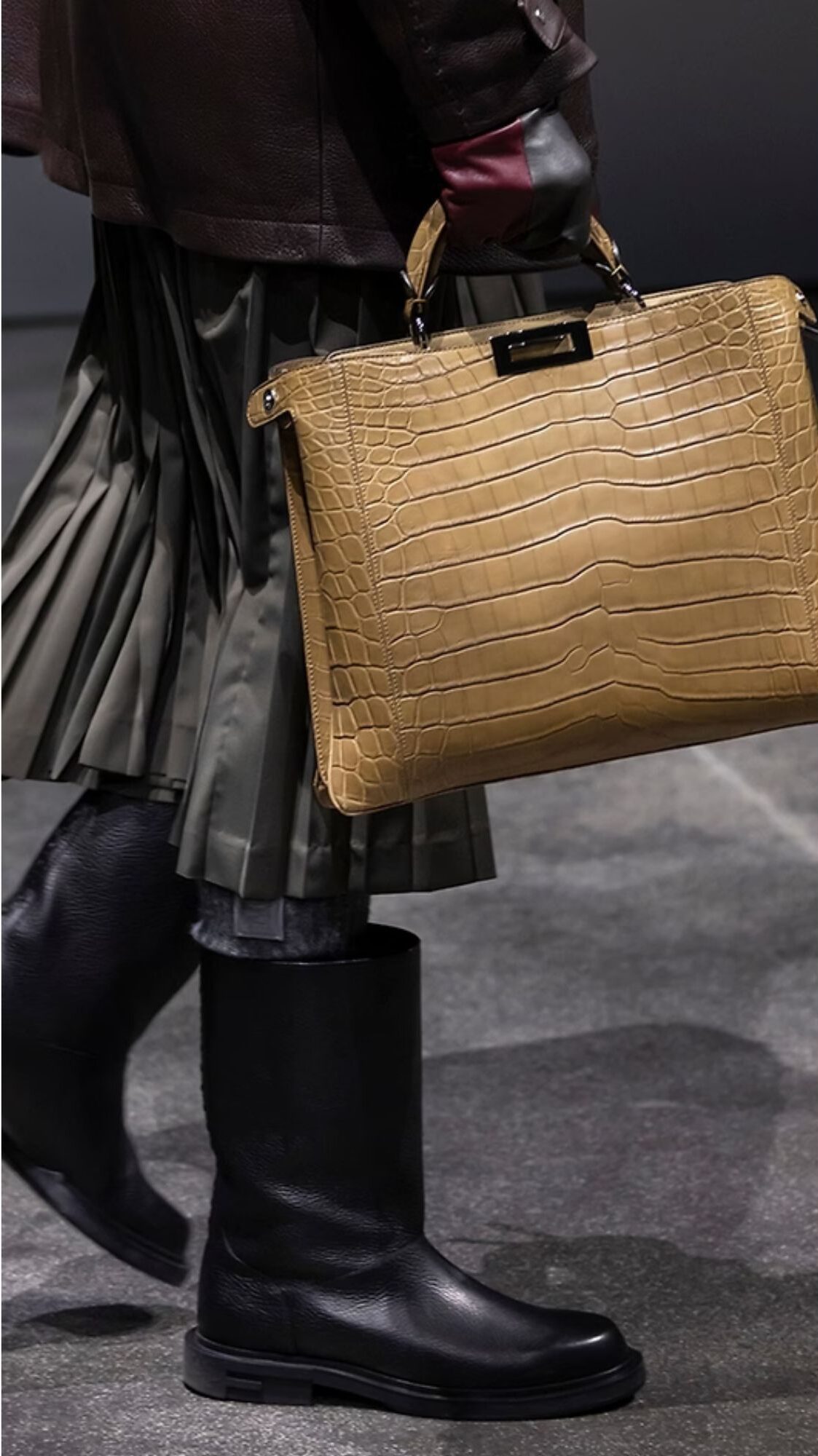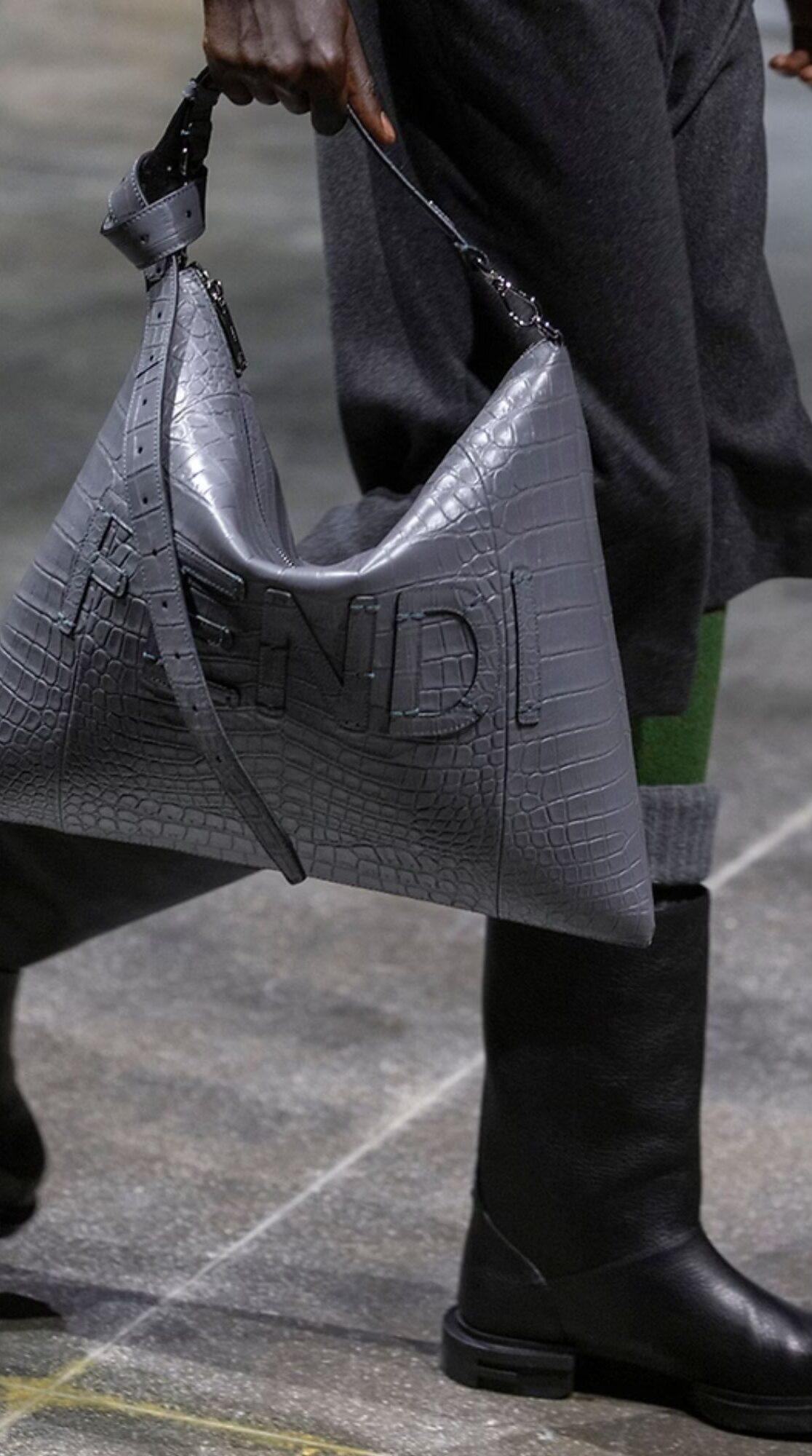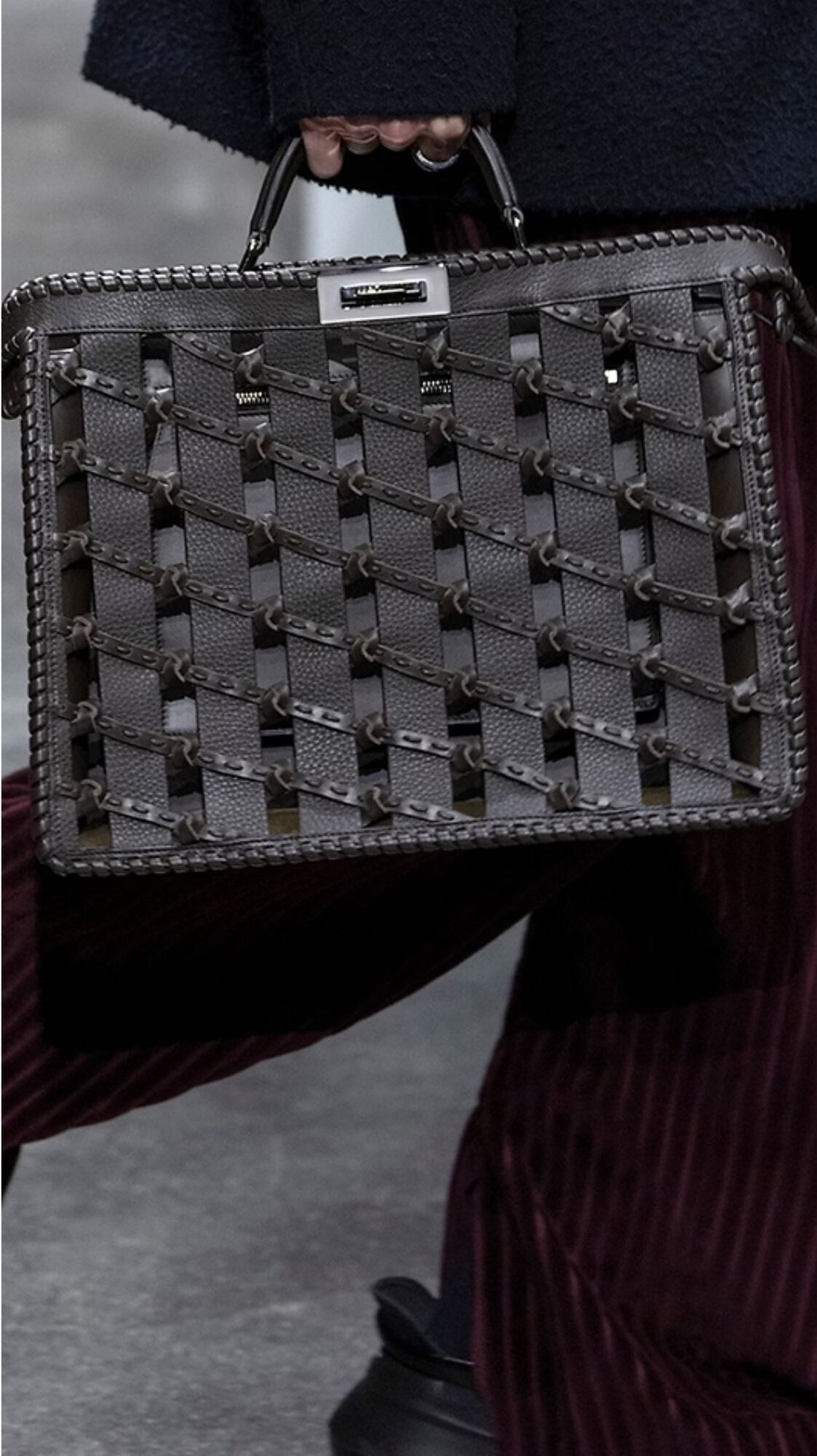 En los accesorios de Fall Winter 24/25, tiene una sofisticación hogareña, que rinde atributo a la manufactura de la piel y Selleria, es todo curvas, contornos, como el nuevo Bolso Siesta, que se aplana como una almohada en acolchado a rayas o shealing; una modularidad plegable de los estilos hobo y la mochila Melón, adornados con herrajes cromados FF2. Los neceseres de piel bicolor y texturizada se levan como irreverentes bolsos de día; mientras que la forma suave y acolchada del Peekaboo ISeeU Soft, regresa junto a líneas biseladas del baúl acolchado Baguette Soft Trunk.