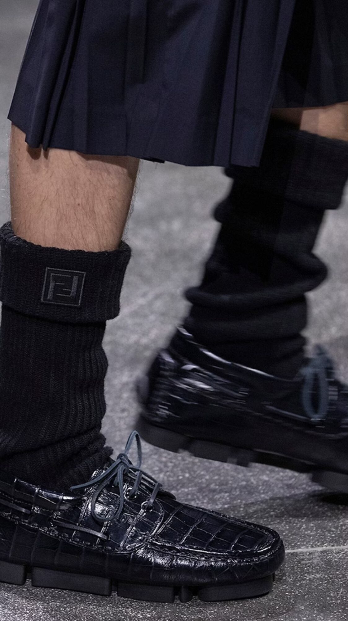 La colección explora la dualidad de lo urbano y bucólico, el espíritu de la falda escocesa se impregna en toda la colección en pantalones cortos, largos y plisados, de cuero y calcetines de montaña; faldas cortas de cuadros con la parte delantera plana o plantalones clásicos retocados con pliegues a lo largo de cada pierna. Las prendas exteriores están diseñados con hombros raglán y botones planos de piel que adornan con cuellos de piel Selleria y detalles que crean un contraste en pana de ante, con abrigos de pescador y chaquetas impermeables de lona FF junto a opulentas bombers y chaquetas diseñadas con ribetes y costuras de piel de oveja en trampantojo. Prendas de punto con bloques de color en la sastrería con toques juguetones, desde el brillo de los tejidos por cable termoprensados, chaquetas de punto acanaladas, dobladillos o puños de triple capa de los jerséis polo y camisetas de tirantes.