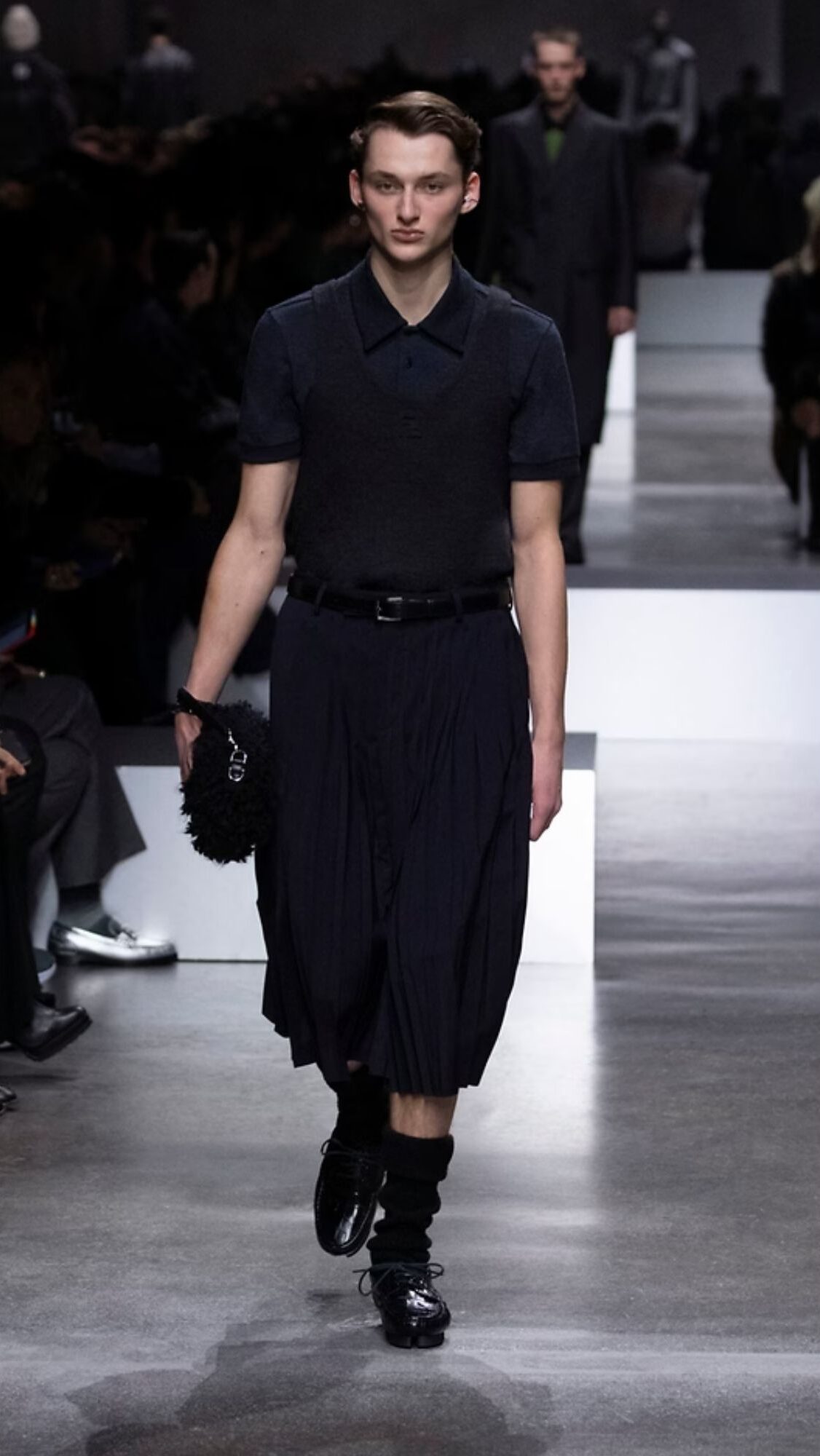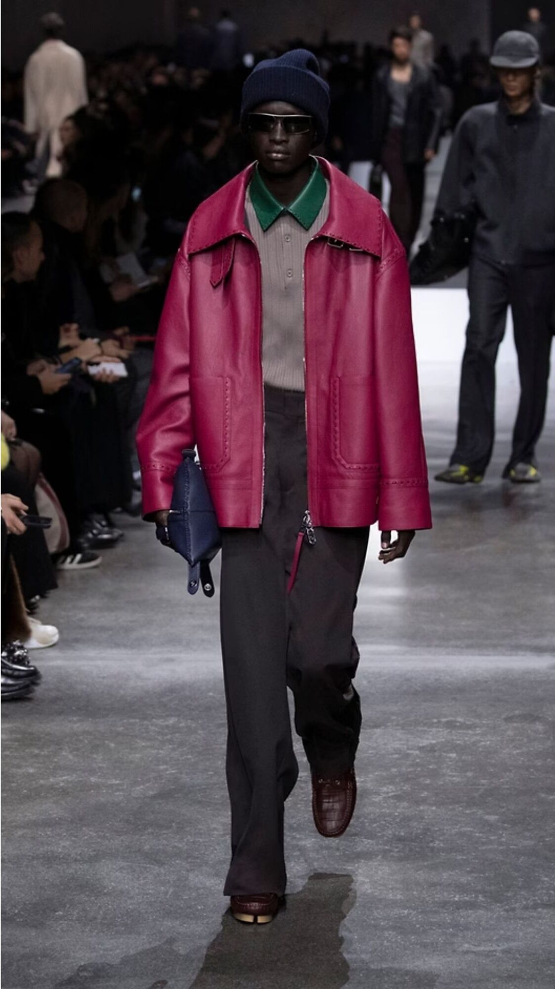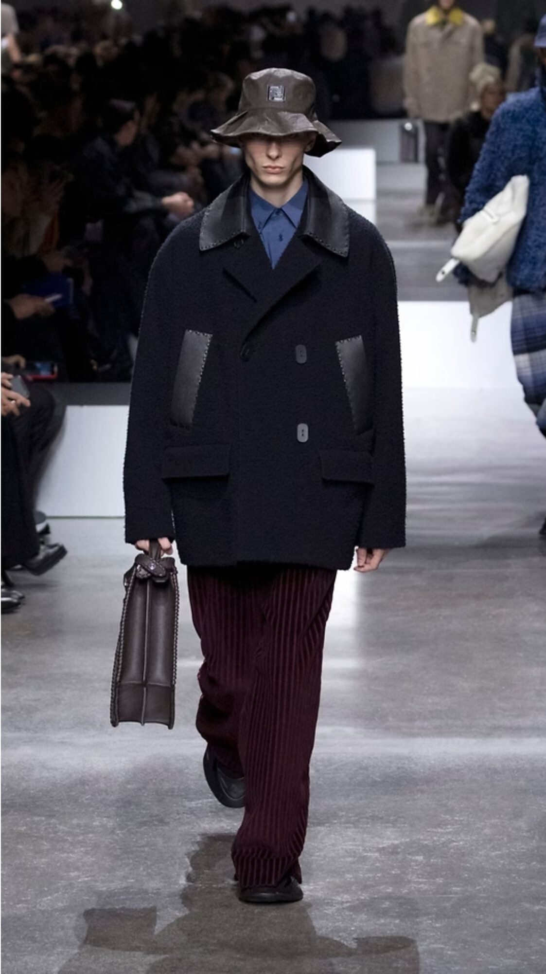 FENDI, ha podido trascender y sorprender, reflexionando sobre el cambiante paisaje de la sartoria, hibridez de la silueta, múltiples significados, que continúan siendo las preguntas constantes en la moda masculina. Para así tener una destreza de las técnicas nuevas y antiguas, uniendo un profundo conocimiento de la cultura; donde abundan las sutiles expresiones Europeas. Con un suave roce de las lanas de manta Casentino hasta el pulido ceroso de las paños para todo tipo de clima y la suave mano de loden. Teniendo una paleta encontramos hibernal de turba y granito, ámbar quemado, carbón y verde bosque, brillantes franjas de azul aciano y azul vaquero, cereza, verde hierba, amarillo canario y gris nube, siendo favorecedores en contraste y lo especial fue tono sobre tono.
