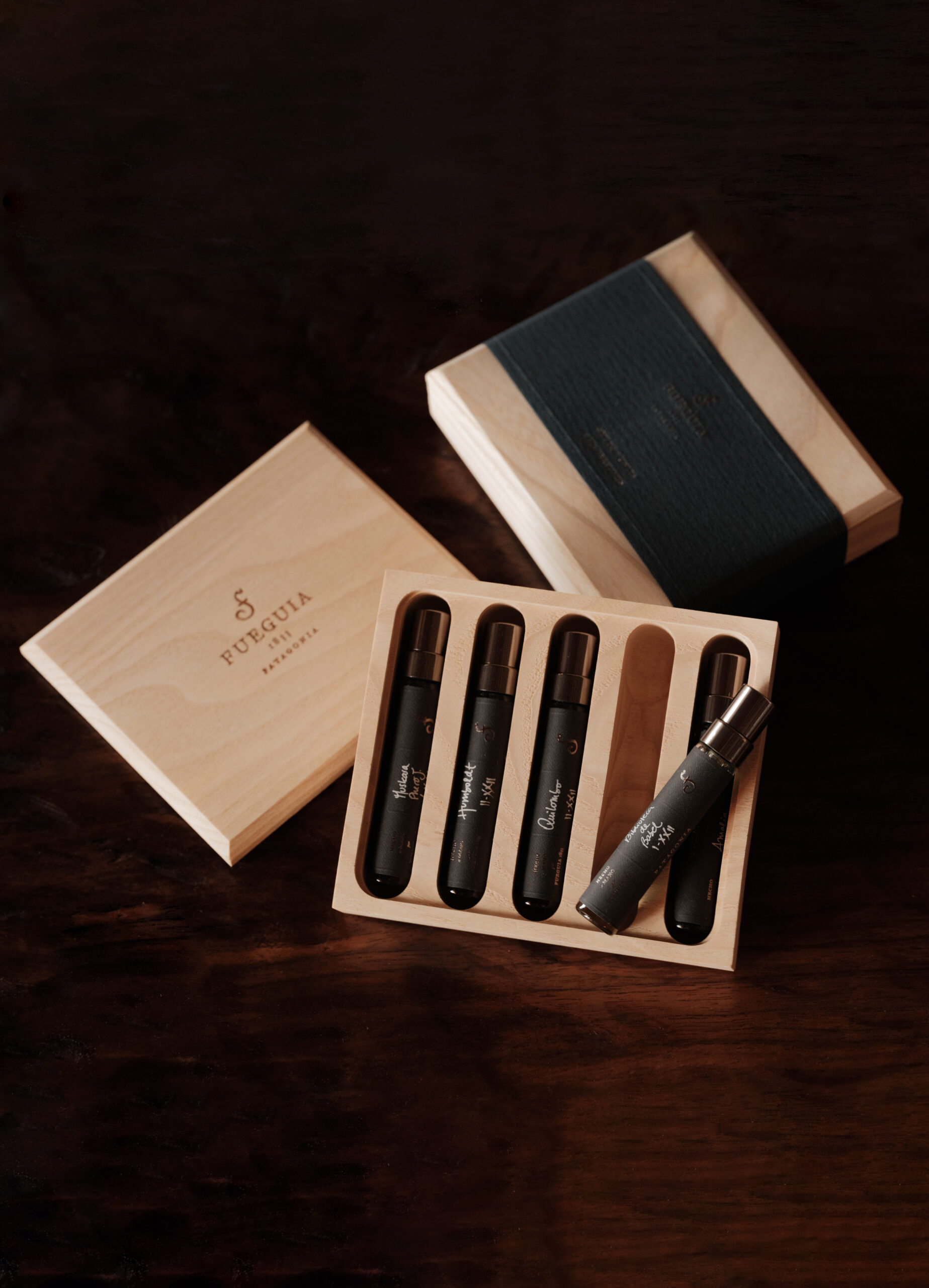 Un kit creado para explorar la colección de más de 120 perfumes de Fueguia que motivan el arte de la mezcla o “composición”. Presentado en una caja de madera hecha a mano, habitan cinco perfumes de 5 ml, complementados con tarjetas informativas de fragancias y un conjunto de toques de composición.