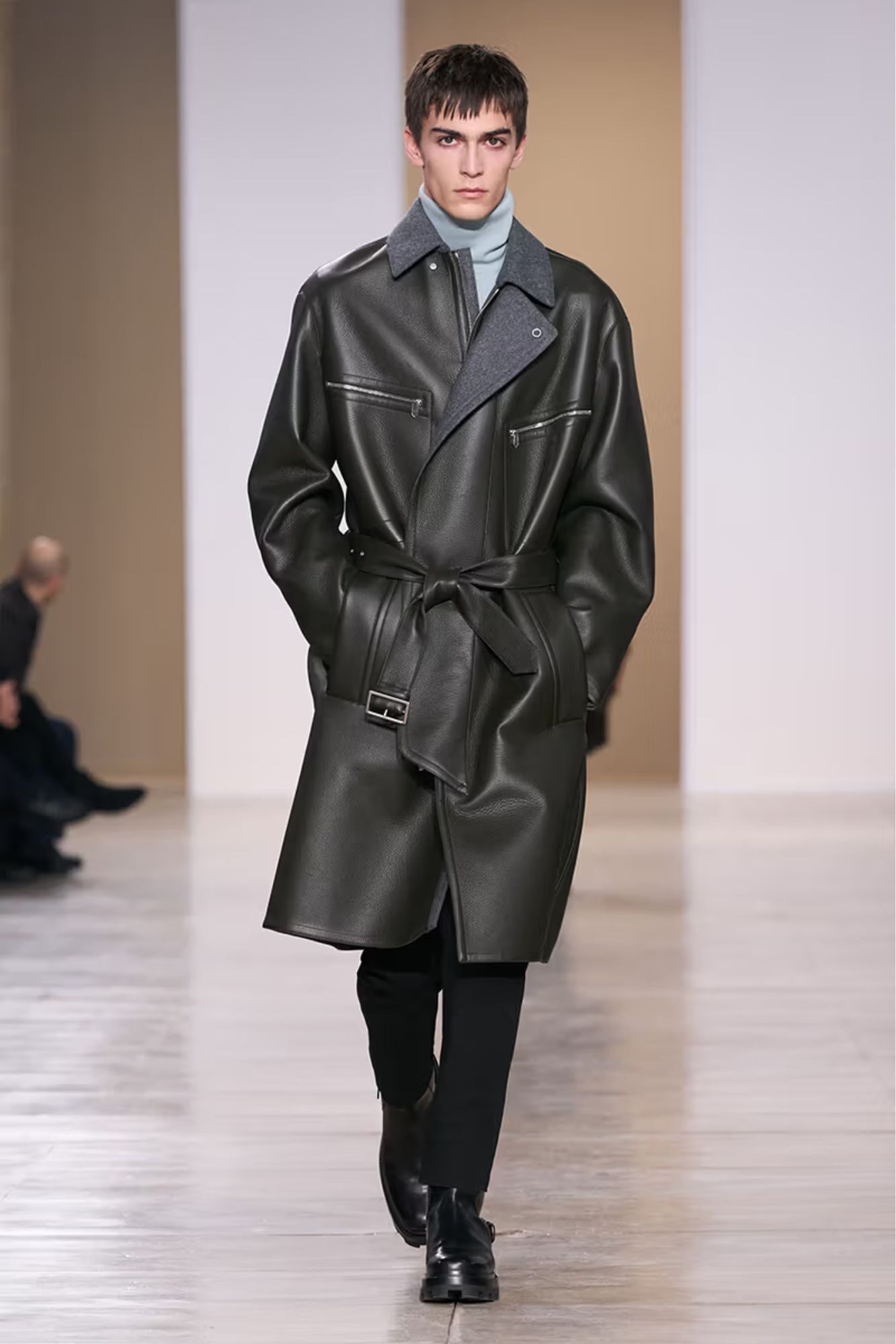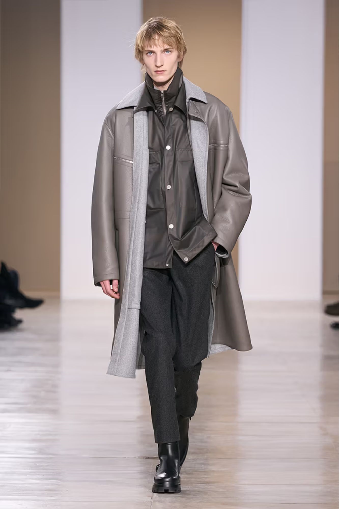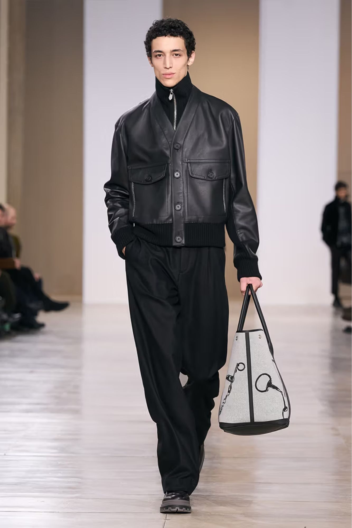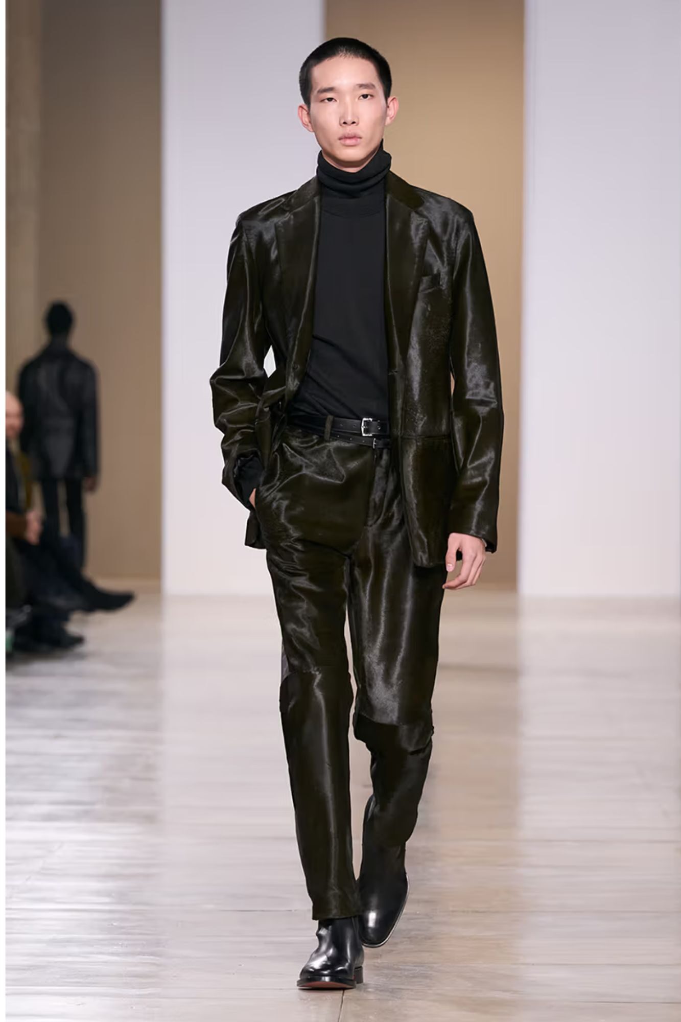 Como siempre, los materiales emanaban exclusividad. Piel de cordero bañada, cuero de estribo, franela de piel de venado, cachemira y alpaca, piel de becerro pulida. Mientras que la paleta era cambiante, pero melódica: caqui, basalto, carbón, anís, azul petróleo, brezo, calabaza, azafrán, sílex y turba.